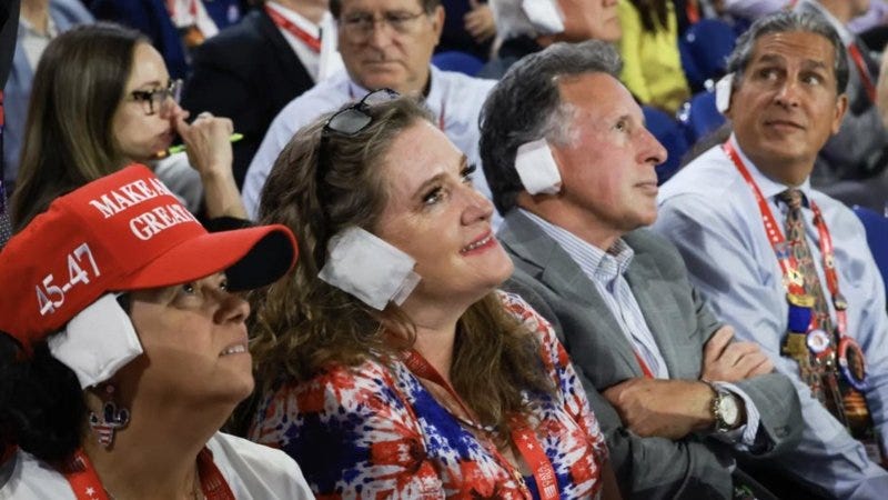 Then there was the RNC with hordes of weirdos in idol worship of their racist rapist God. Some even came with maxi pads strapped to their ears in solidarity with Trump who’d survived a recent assassination attempt. A live streamed assassination attempt of a former President, current Presidential nominee that came and left the news cycle in a few days flat.